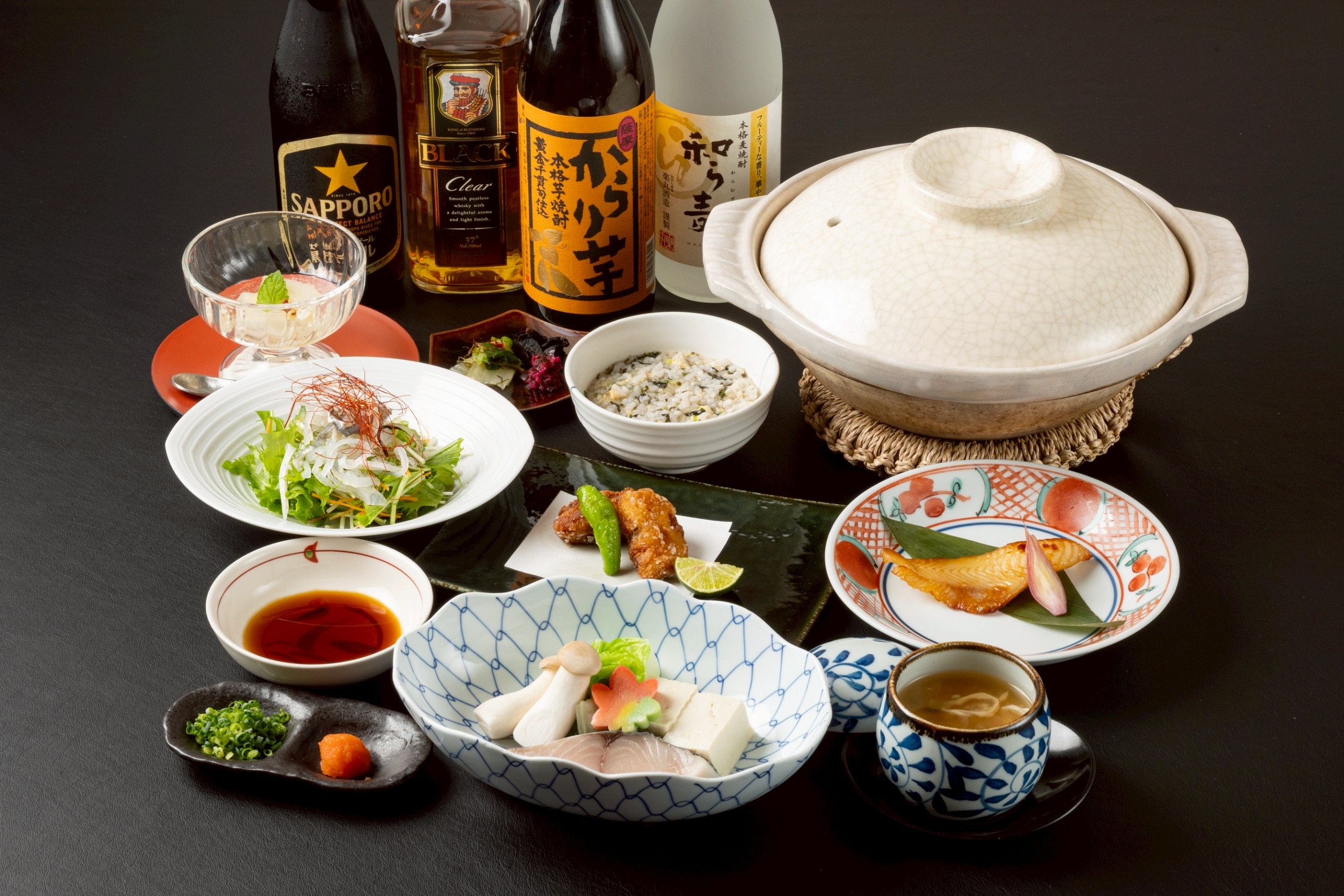 【前菜】旬のお魚南蛮漬け・ごま豆腐・大根金平 【焼物】鶏の香味焼 【揚物】ふぐの唐揚げ 【鍋物】海鮮寄せ鍋 ・ズワイ蟹しゃぶしゃぶ(+800円で蟹足1本追加可能) ・本日おすすめの鮮魚 ・鶏の手羽もと ・名古屋コーチンつくね 【香物】京漬物盛合わせ 【食事】雑炊 +500円でうどんも追加可能です 【水物】デザート 注意事項 ※2名様以上で承ります |