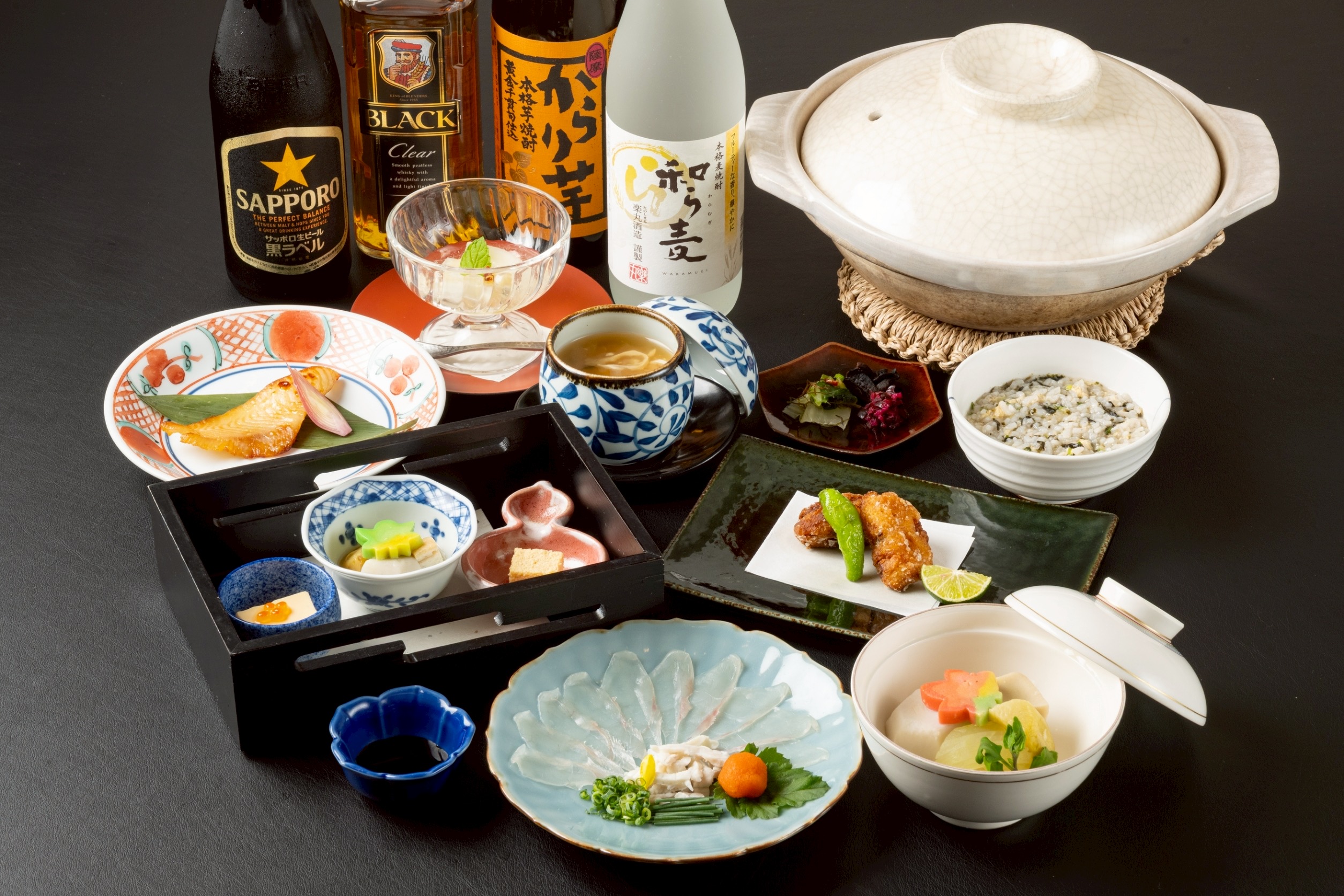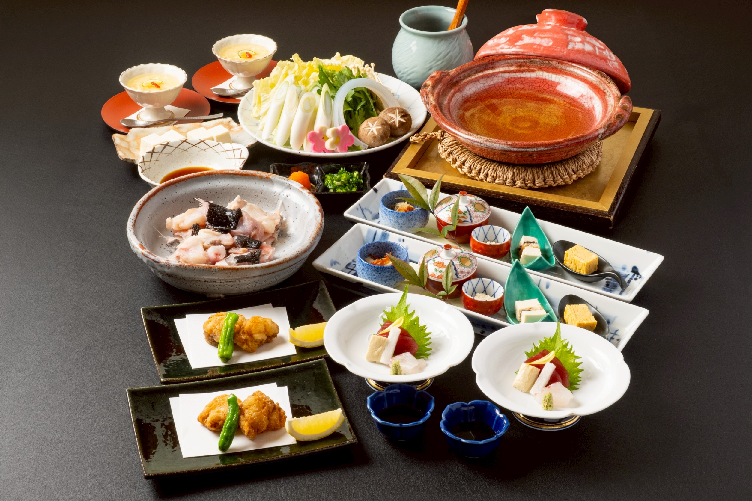 全8品、本格的な和食ととらふぐの鉄刺が付いた豪華宴会コース。冬以外でもご注文いただけます。